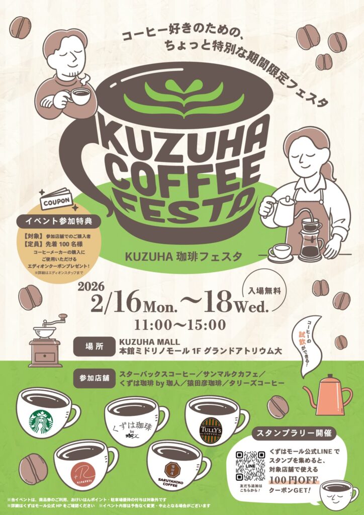 2026年2月16日(月)〜18日(水)まで、樟葉駅前のKUZUHA MALL本館ミドリノモール1階グランドアトリウム大にて「KUZUHA 珈琲フェスタ」が開催されます。