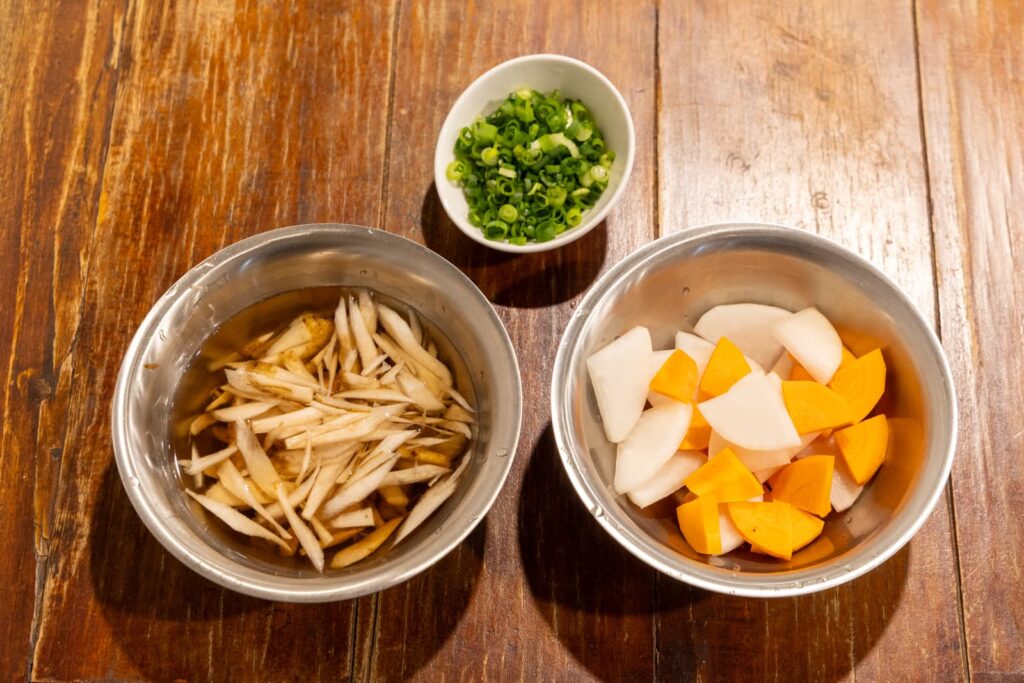 にんじんと大根はそれぞれいちょう切りに。うす揚げは油抜きをして短冊切り、青ねぎは小口切りにします。