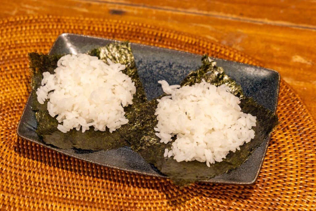 焼きのりを広げ、その上に酢飯とタレをからめたさばをのせ、きゅっと巻けば完成!