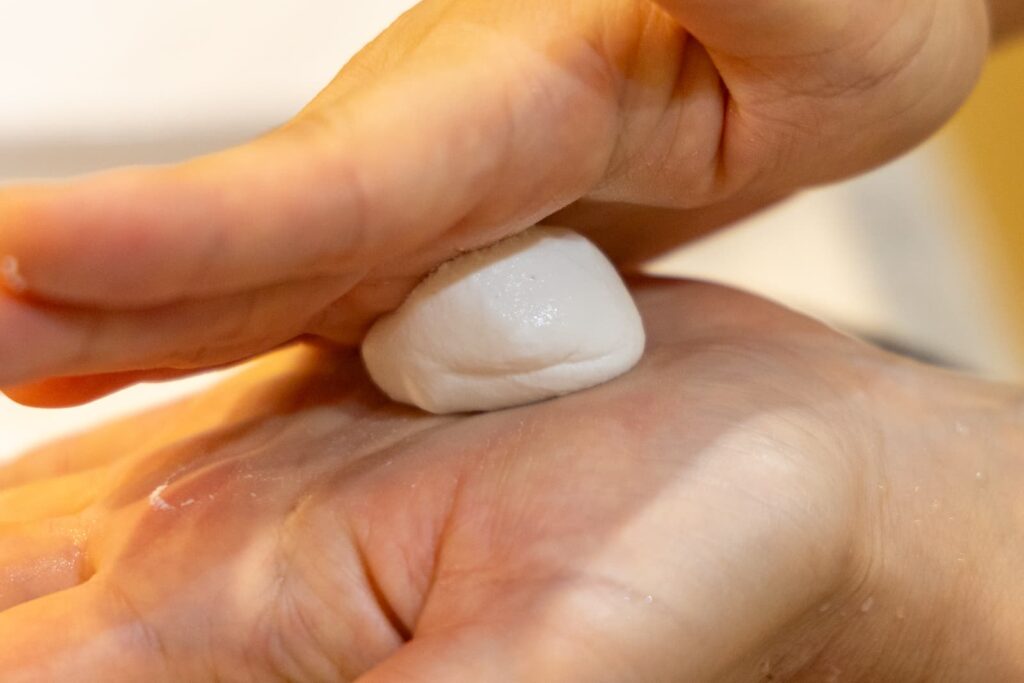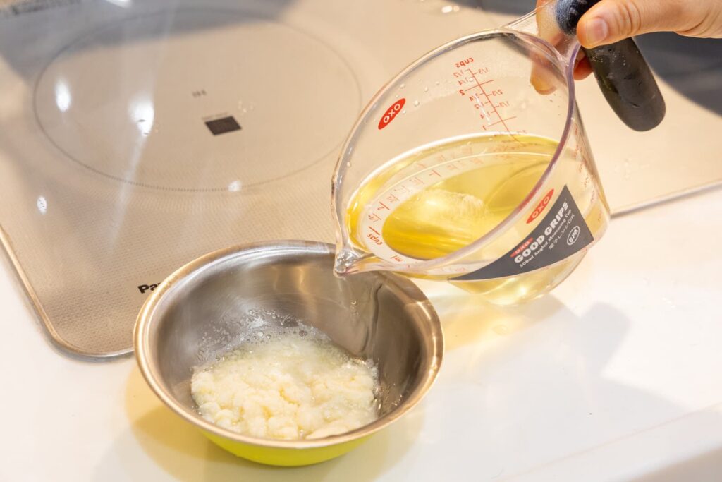 白玉粉に少量ずつ水(分量外)を加え、耳たぶくらいのやわらかさになるまで混ぜます。