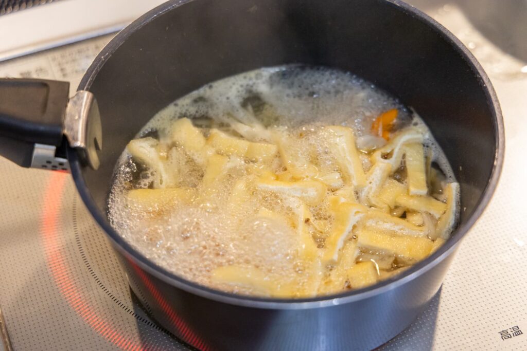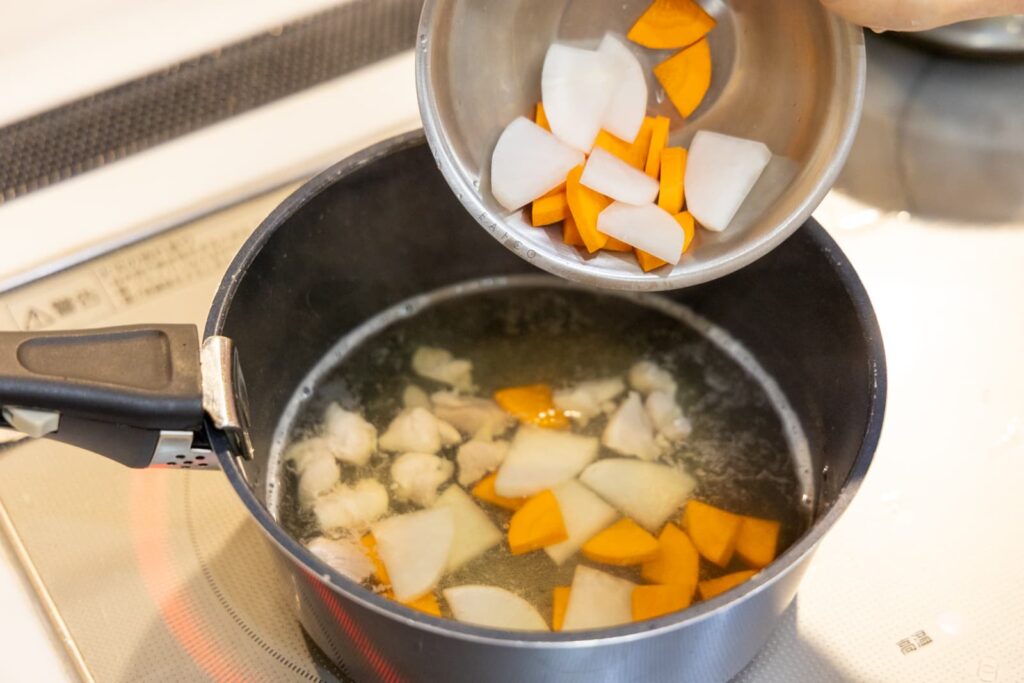鍋にだし汁を入れて火にかけ、沸騰したら鶏肉を入れます。アクを丁寧に取りながら、ごぼう、にんじん、大根、うす揚げを順番に加えて煮ていきます。