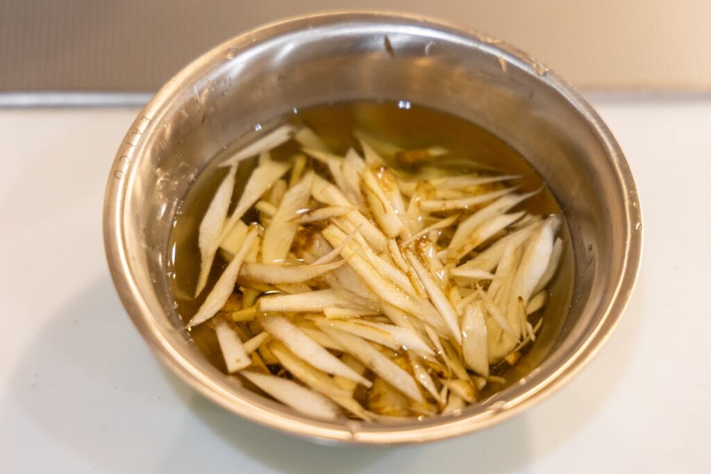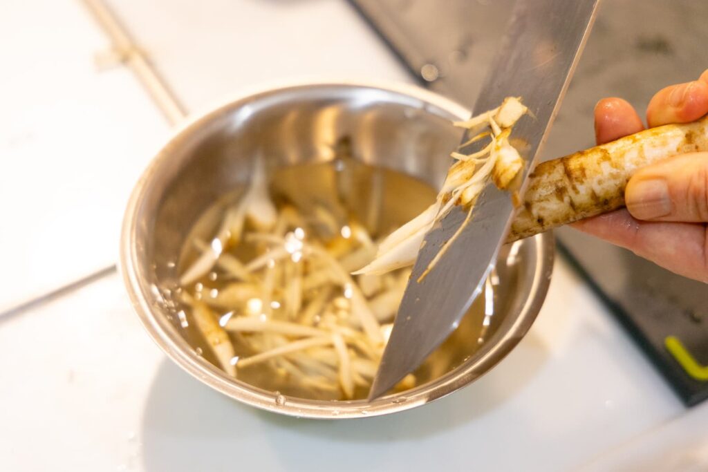 まずは具材の準備から。鶏もも肉は1cm角に、ごぼうはささがきにして水にさらします。