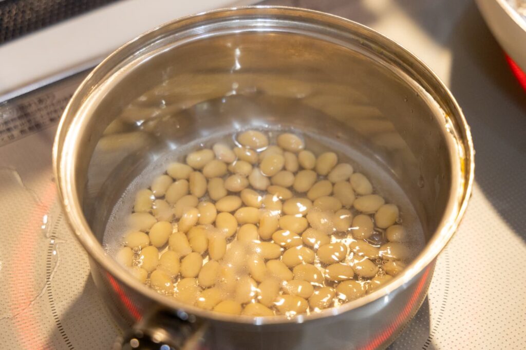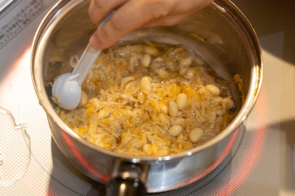 砂糖、濃口しょうゆを加え、大豆に味がつくまで煮ます。