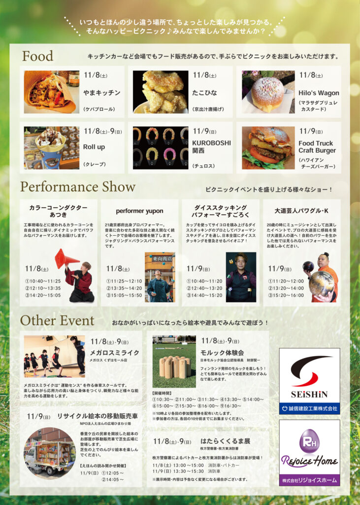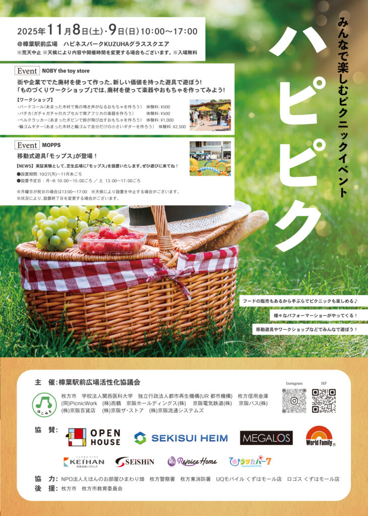 2025年11月8日(土)・9日(日)に、樟葉駅前広場「ハピネスパーク KUZUHA グラススクエア」にて、ピクニックイベント「ハピピク」が開催されます。