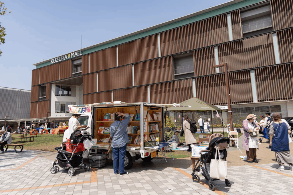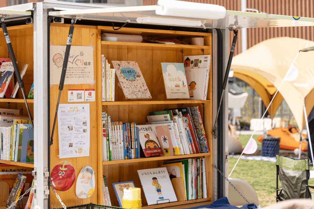 香里ケ丘の民家を開放した絵本のお部屋が移動販売車で芝生広場に登場します。