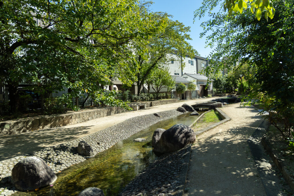 淀川の水を引き込んだ水路を整備し、人と自然が心地よく共存できる散策路として親しまれている「水面回廊(みなもかいろう)」。