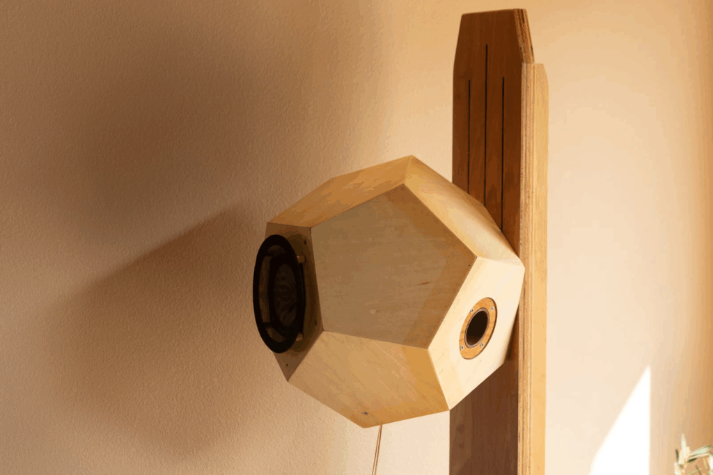 水面回廊をバックにしたステージの両サイドには、お知り合いの音響マニアの方が作った、手作りのスピーカーが設置されています。