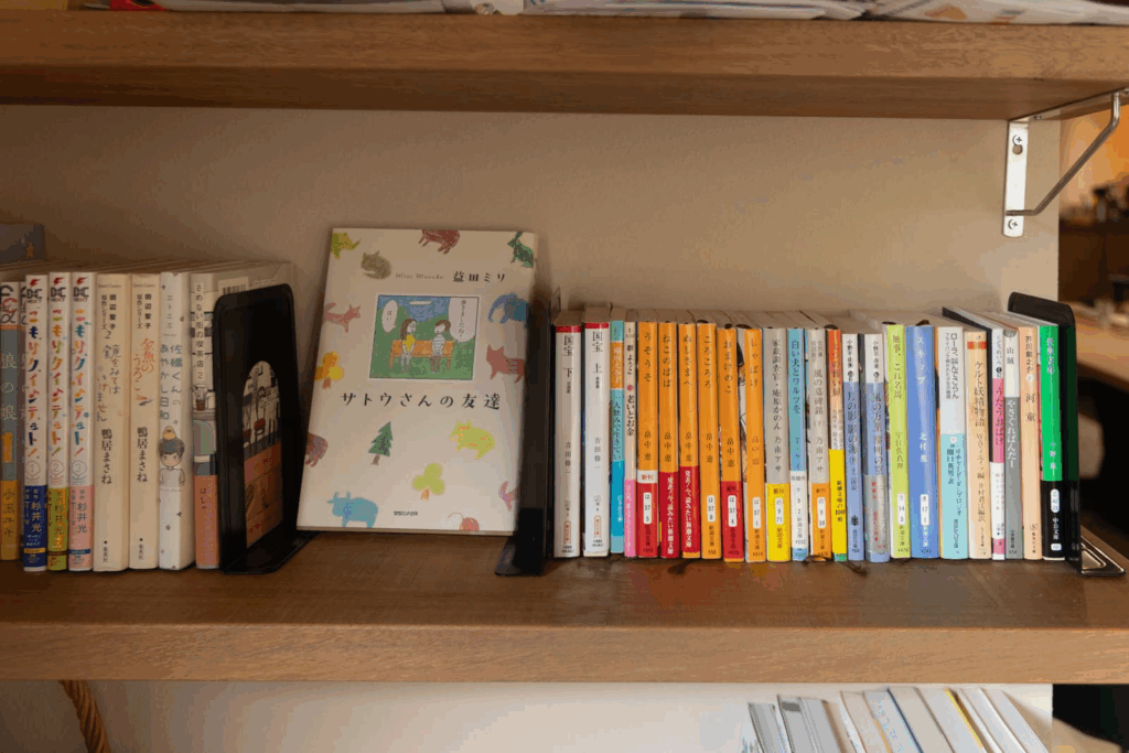 本棚やテーブルはオーダーメイド。古木で作られたものだそうで、深い色合いが落ち着いた雰囲気を醸し出しています。