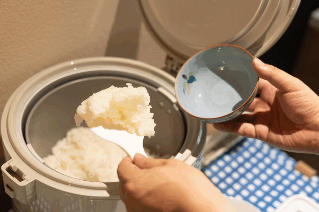 ガス火で炊き上げるふっくらもっちりとした白飯は、「美味しい!」と評判で、自分でよそっていただきます!