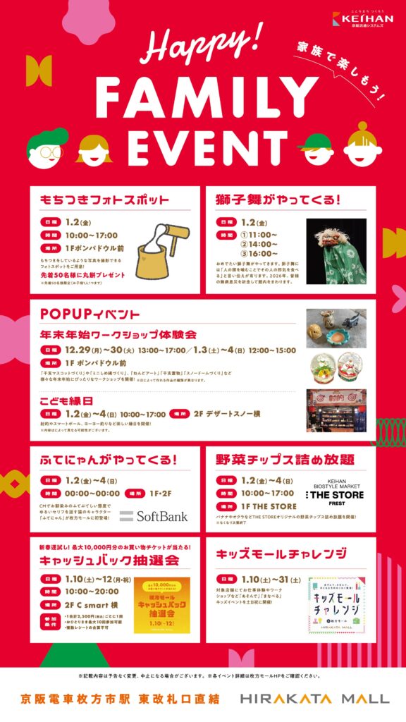 2025年12月29日(月)から、枚方市駅前の枚方モールにて「HAPPY FAMILY EVENT」が開催されます。