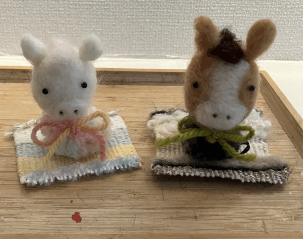 ふわふわの羊毛をチクチクして、来年の干支”午“をかわいいマスコットに仕上げます。手のひらサイズで、手織りの敷物に乗せて飾れば小さな置物としても。色はホワイト×ピンクとベージュ系の2色から選べます。ニードルワークの初心者、お子さまから大人まで手ぶらでご参加ください。むずかしいと思ったらサポートしますので安心して楽しめます。