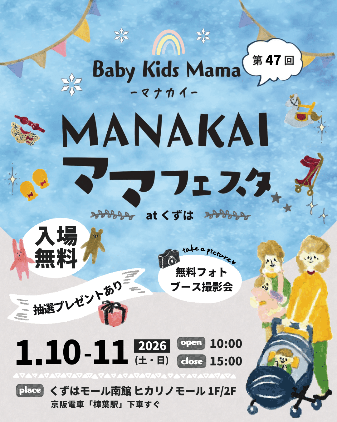 2026年1月10日(土)・11日(日)の2日間、くずはモール南館ヒカリノモール1F SANZEN-HIROBA付近・2F トイザらス前 、サンマルクカフェ+R 前にて、ベビー・キッズ・ママ・ファミリーのためのマルシェ「マナカイママフェスタ」が開催されます。