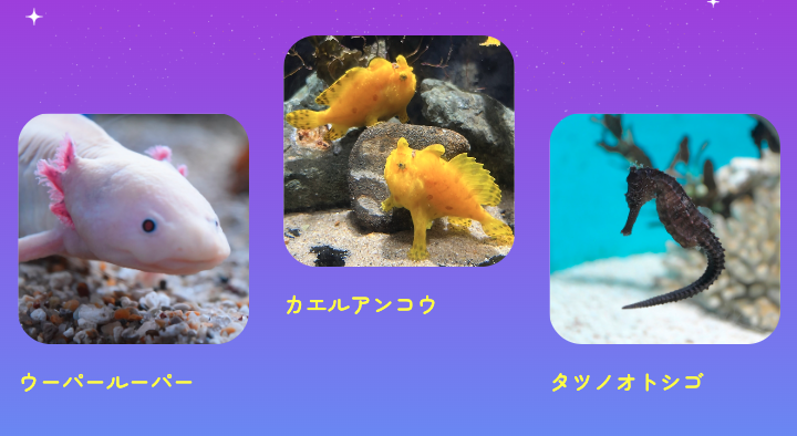 ウーパールーパー、カエルアンコウ、タツノオトジゴなど、100種類以上の水生生物たちに出会えます。