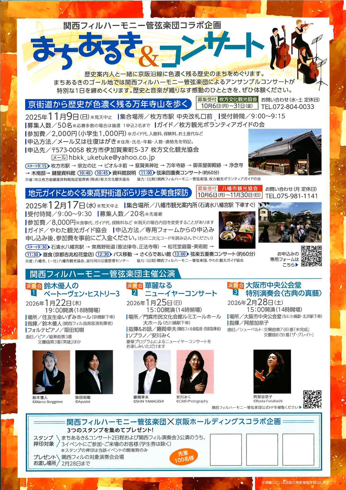 2025年11月9日(日)、京阪沿線に色濃く残る歴史のまちをめぐり、鍵屋資料館でコンサートを楽しむ「関西フィルハーモニー管弦楽団コラボ企画『まちあるき&コンサート』」が開催されます。