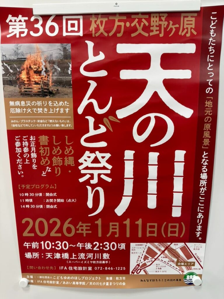 2026年1月11日(日)に、天津橋上流河川敷(天野川河川敷:スーパーイズミヤ枚方店裏手)にて、「天の川とんど祭り」が開催されます。