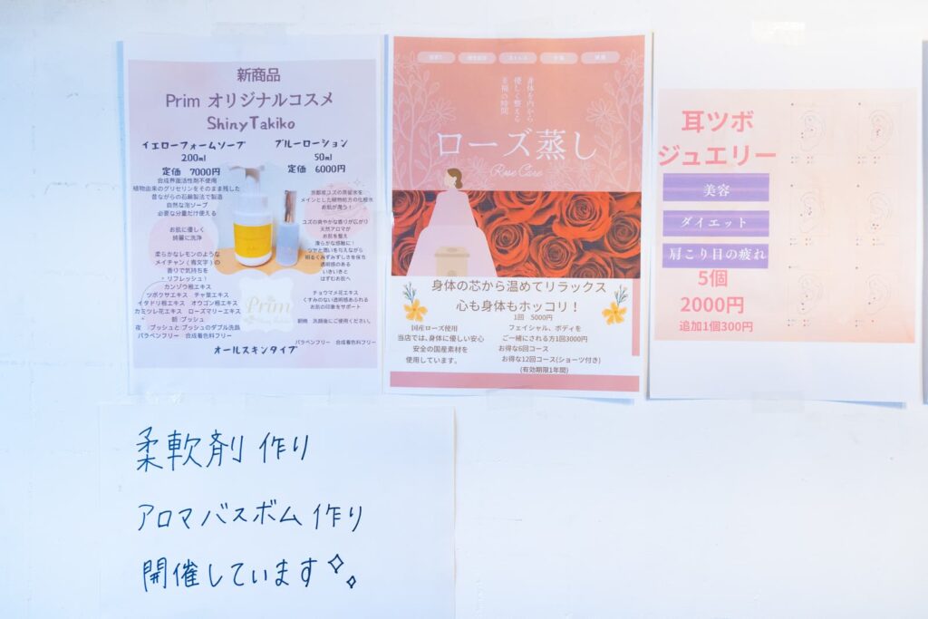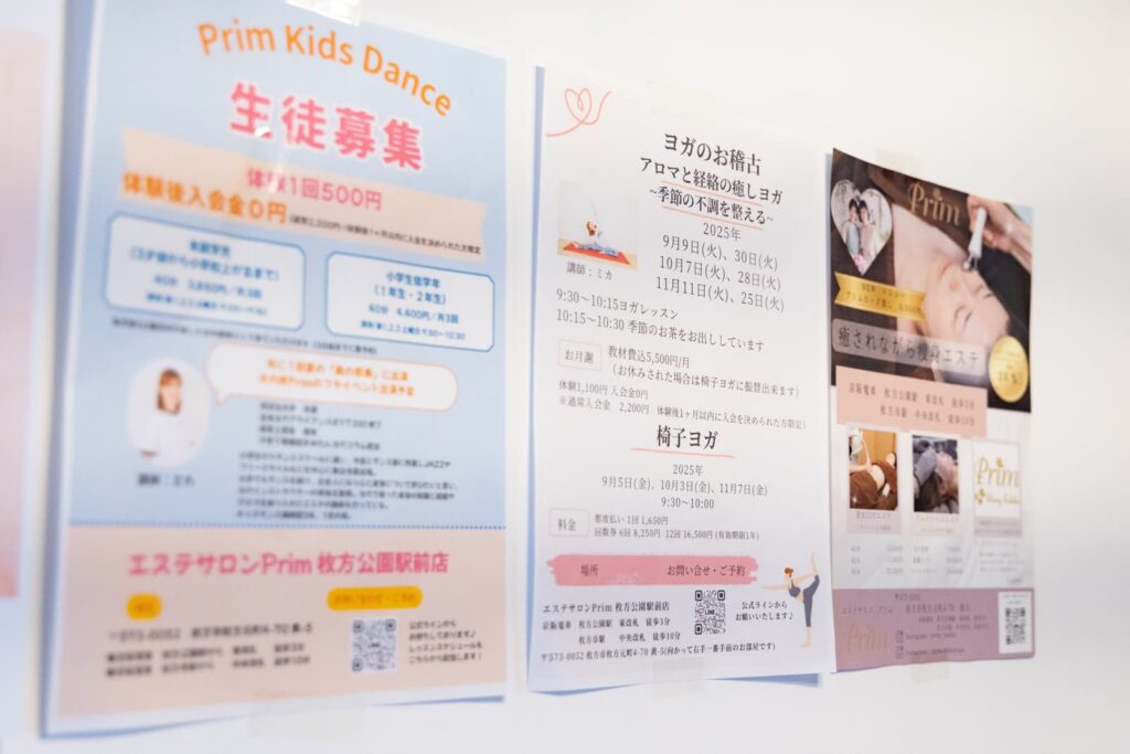「Prim」は、枚方市枚方公園駅から歩いてすぐの、「長屋つぎのひ」に入居しているエステサロンで、2025年5月11日に移転オープンしました。