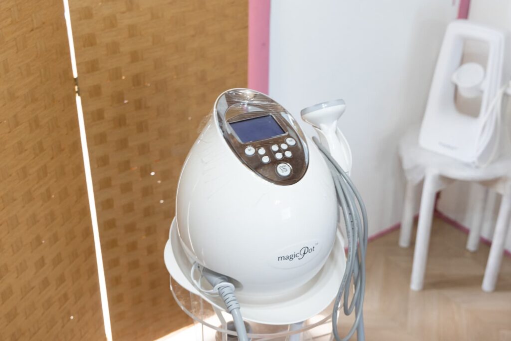 もう1台は「部分痩せ」に特化したマシンです。「どうしてもこの部分だけ痩せたい」というご要望に応えるためのもので、ラジオ波とクラッシュ吸引で、皮下脂肪を温めて燃焼させていきます。