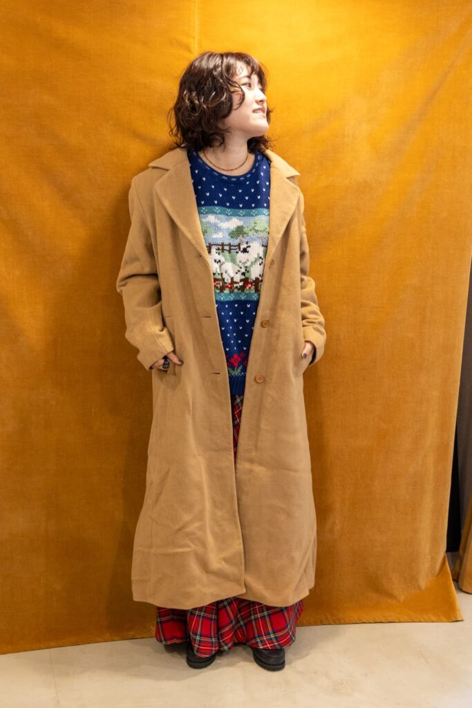 ワンピースにトップスを重ね着した、シンプルで温かみのあるコーデ。トップスはカシミヤ素材。古着は、素材でみた時に今に比べると安く手に入ることができるというのも魅力のひとつ。カシミヤやシルクなどの高級素材を使ってる服など、今ではなかなか使われない素材も、昔はたくさんあったので、そういうポイントで選んでみるのみもおすすめ。