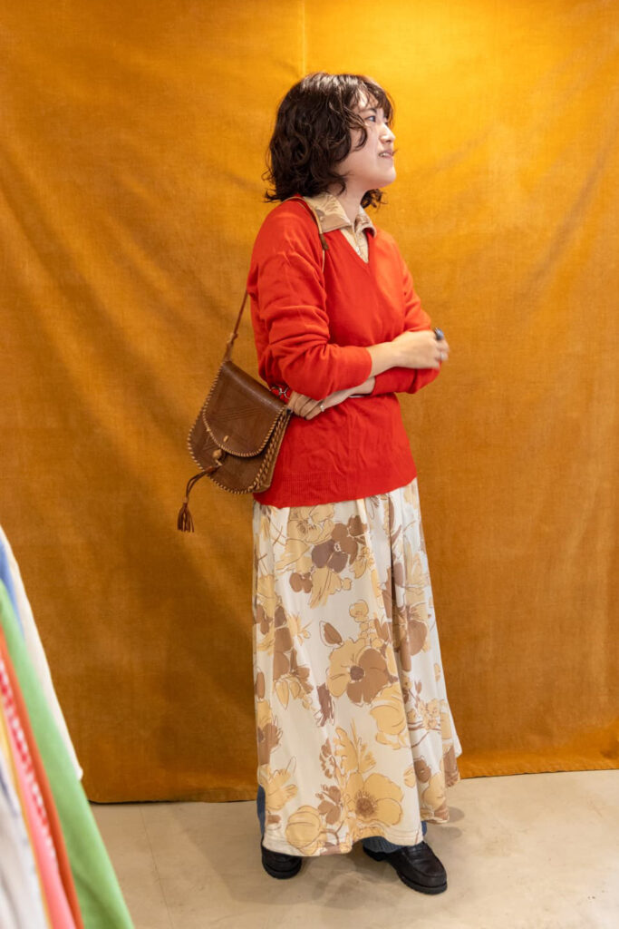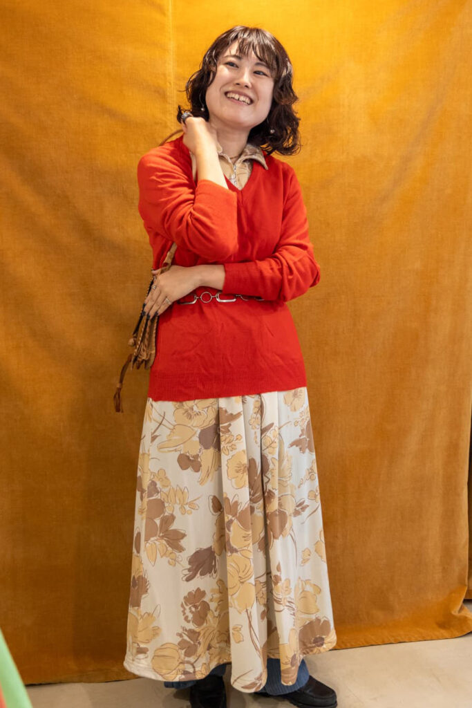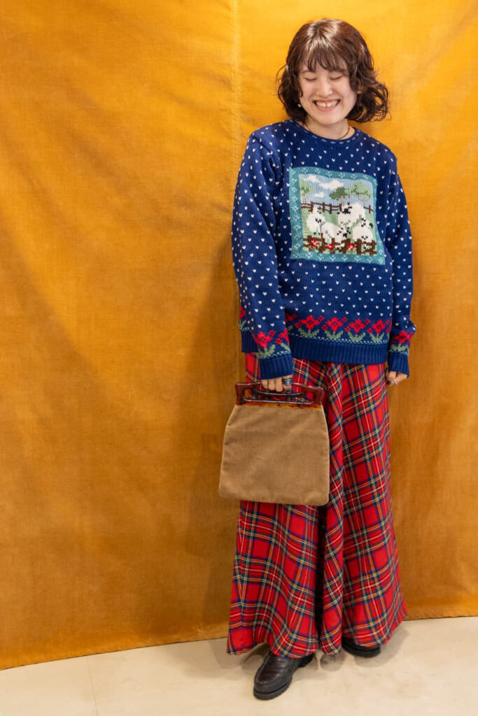 冬らしいあったかコーデ。羊があしらわれたニットがチャーミング。古着にはこういった動物が描かれたものも多いのだとか。チェックの赤いロングスカートが鮮やか。