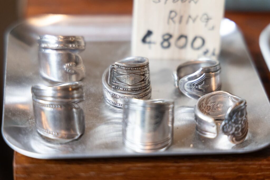 その中でもちょっと高価で珍しいアイテムとして、海外のヴィンテージスプーンを曲げて作ったスプーンリング(4,800円)があります。