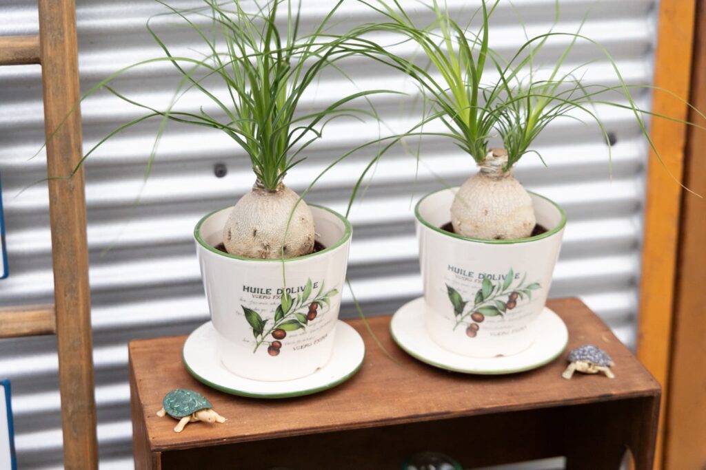 徳利(とっくり)の形に膨らんだ株元と、細長い葉を長く垂れ下げる姿が特徴的な植物。