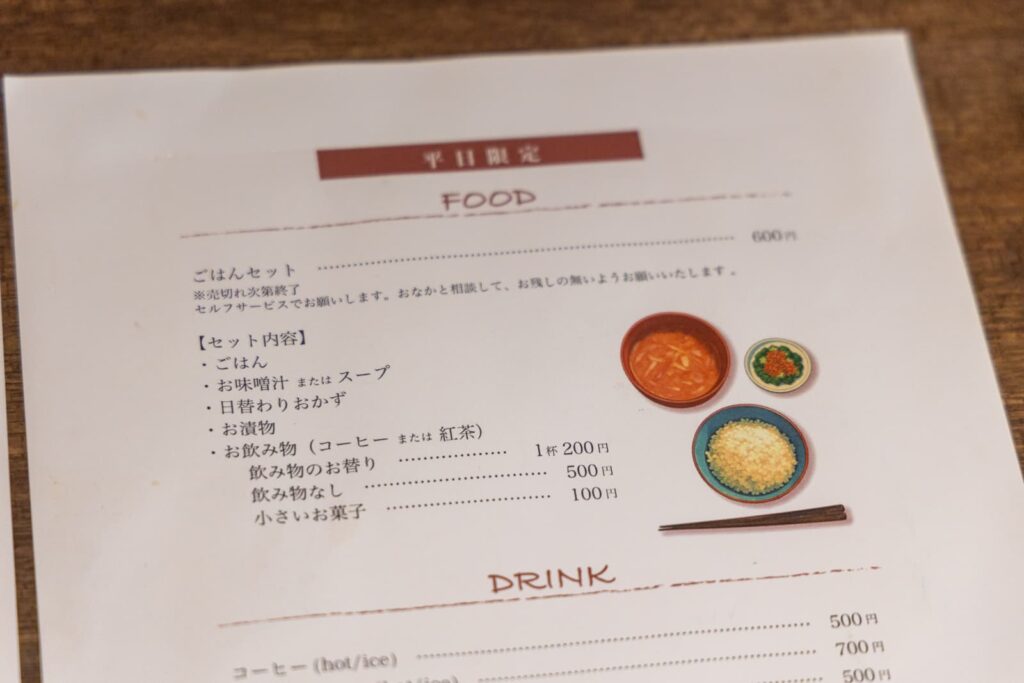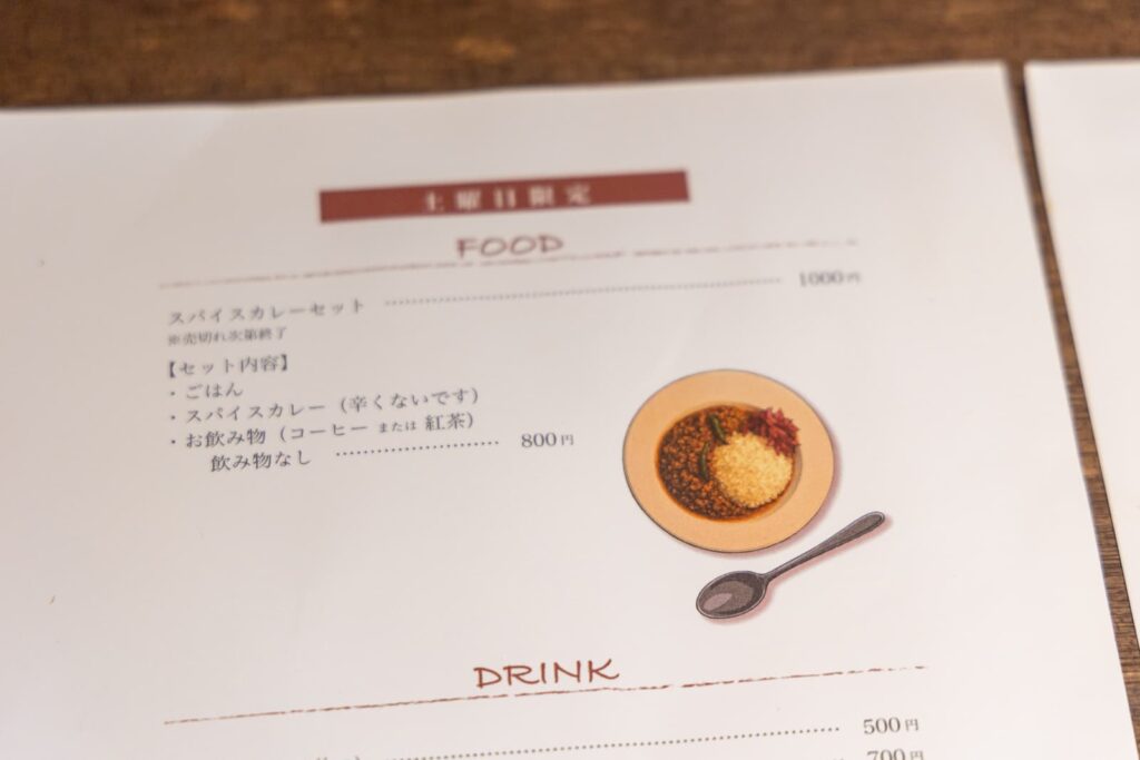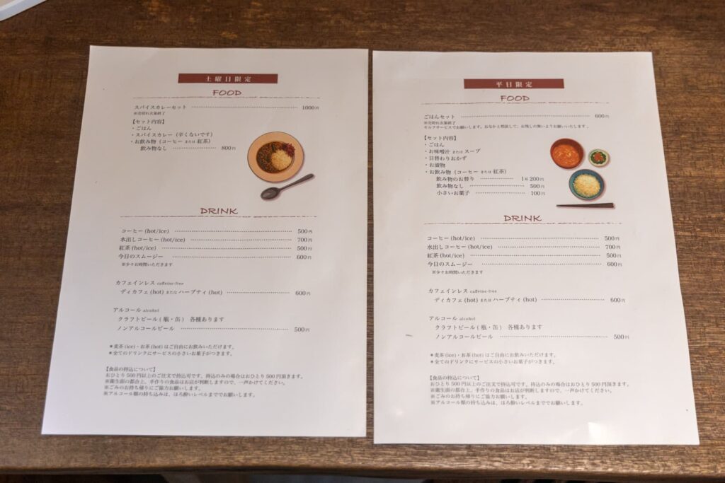 平日は「ごはんセット」。土曜日は「スパイスカレー」を提供されています。