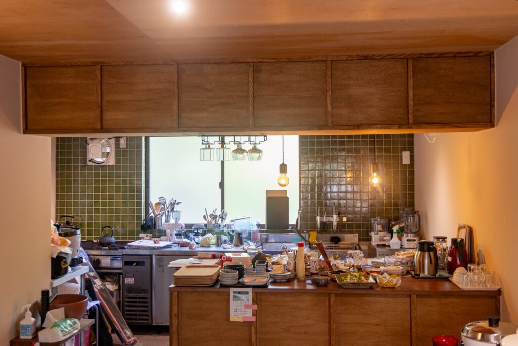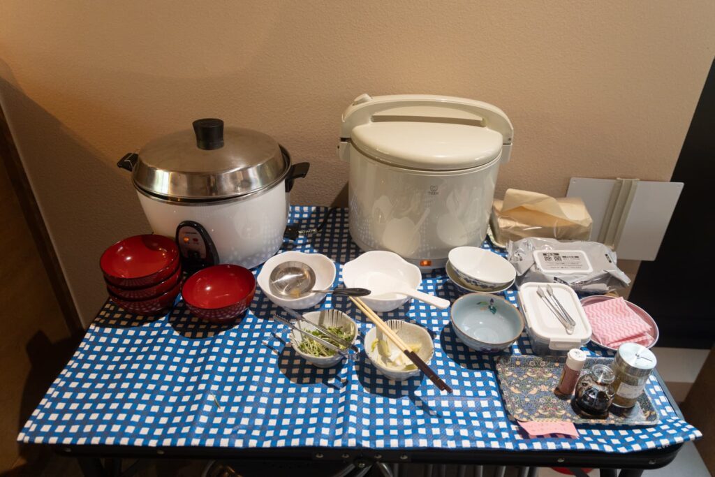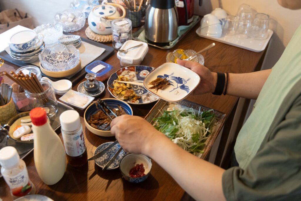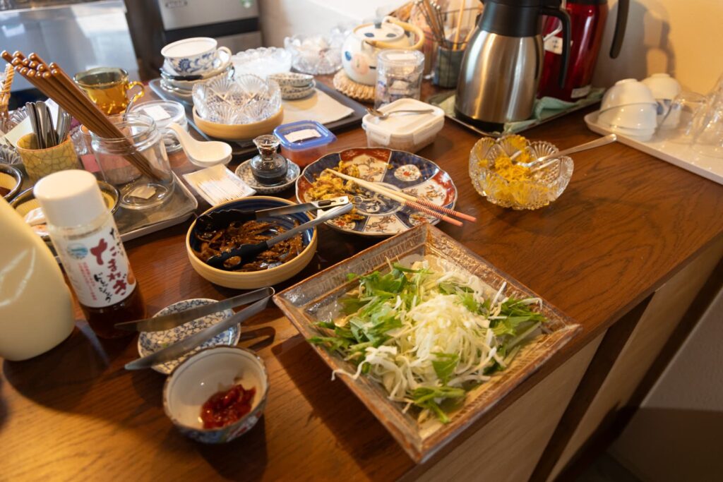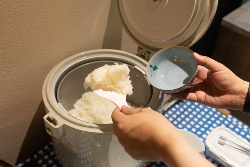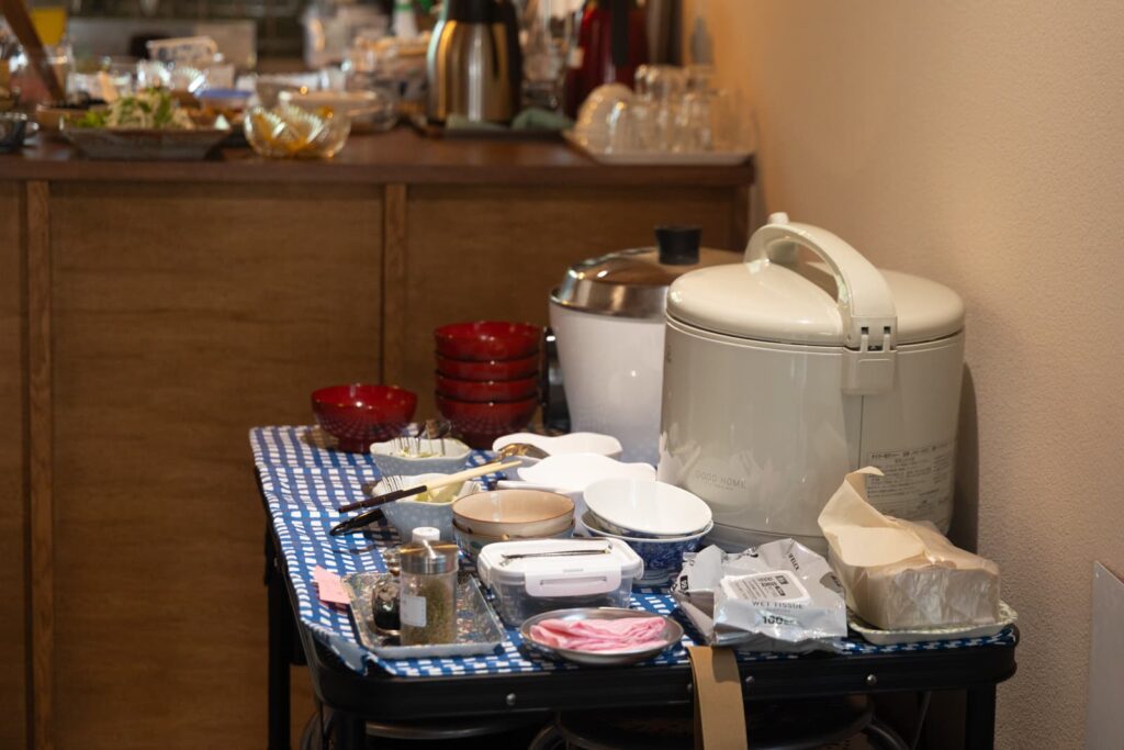 お店は朝7:00から(※冬の間は8:00から)オープンしていて、朝ごはんを戴くことができます。ご飯は自分でよそうスタイル。