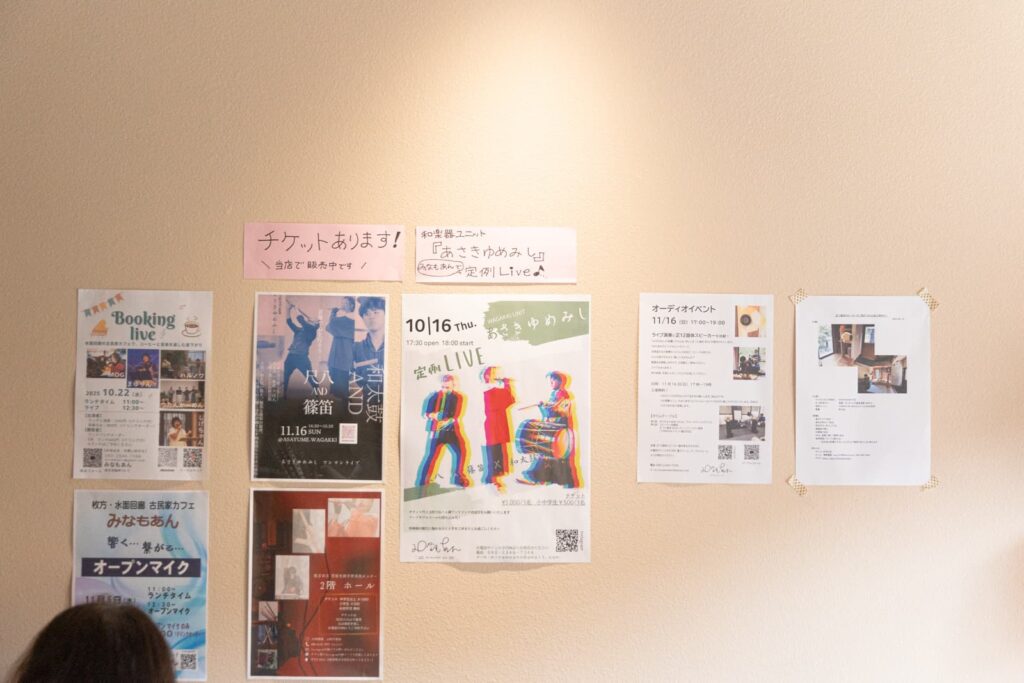 オープンマイクという誰でも歌っていいイベントや、和楽器の演奏など、様々なライブがここで行われています。