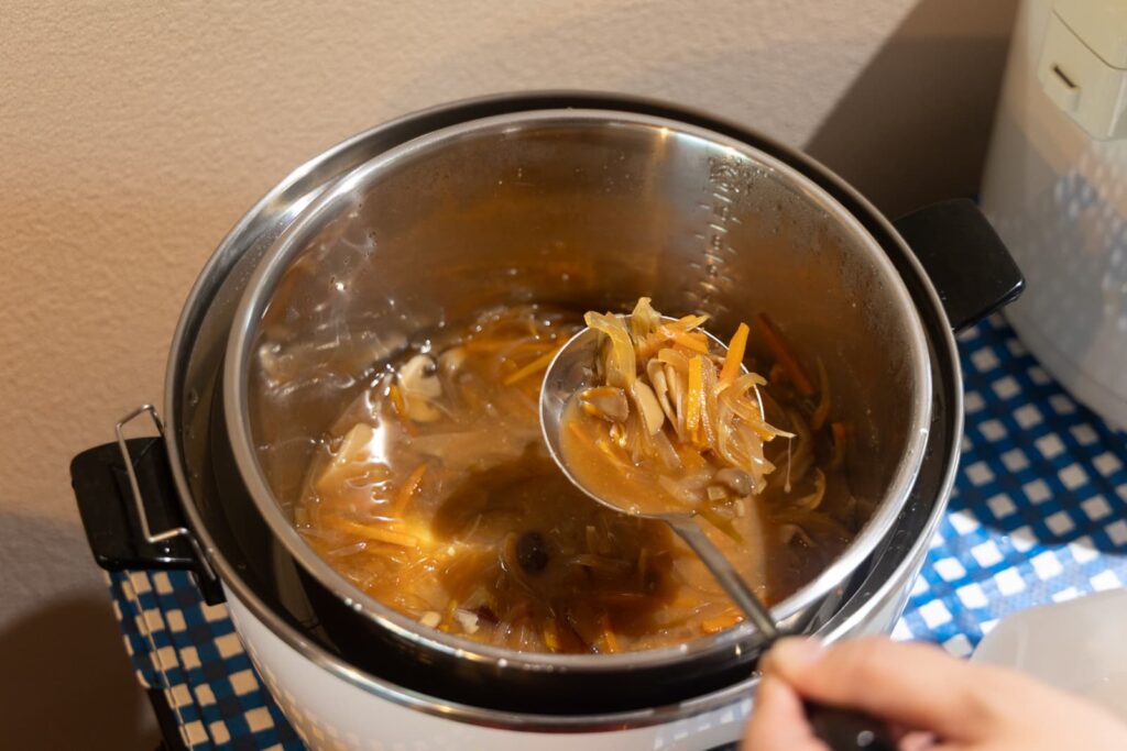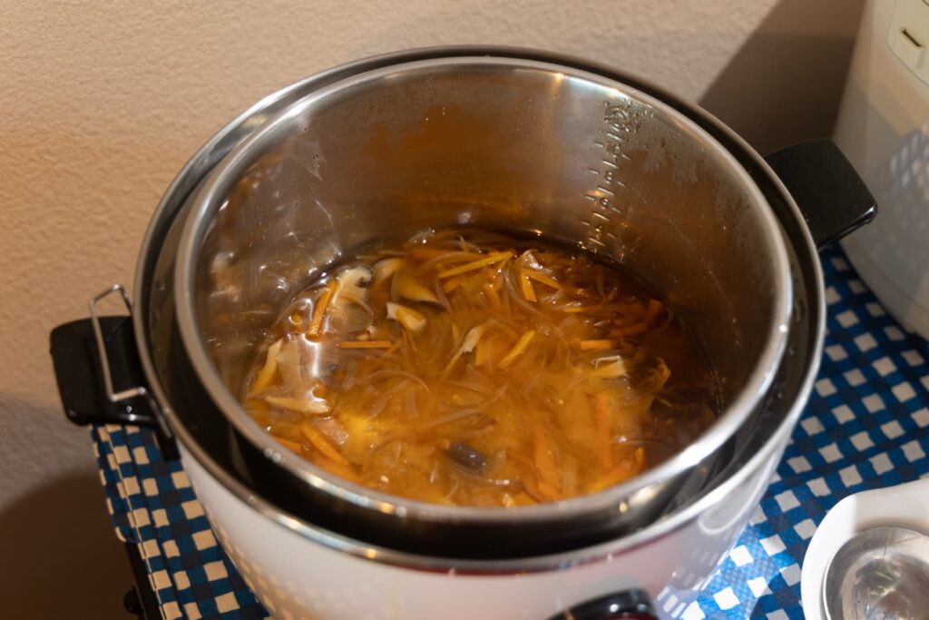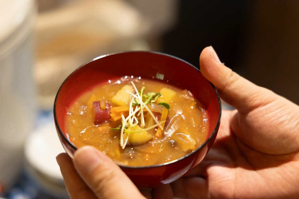 お味噌汁にもこだわりが。重ね煮という素材を層のようにお鍋に重ねて煮込む方法で食材の旨みを引き出していきます。