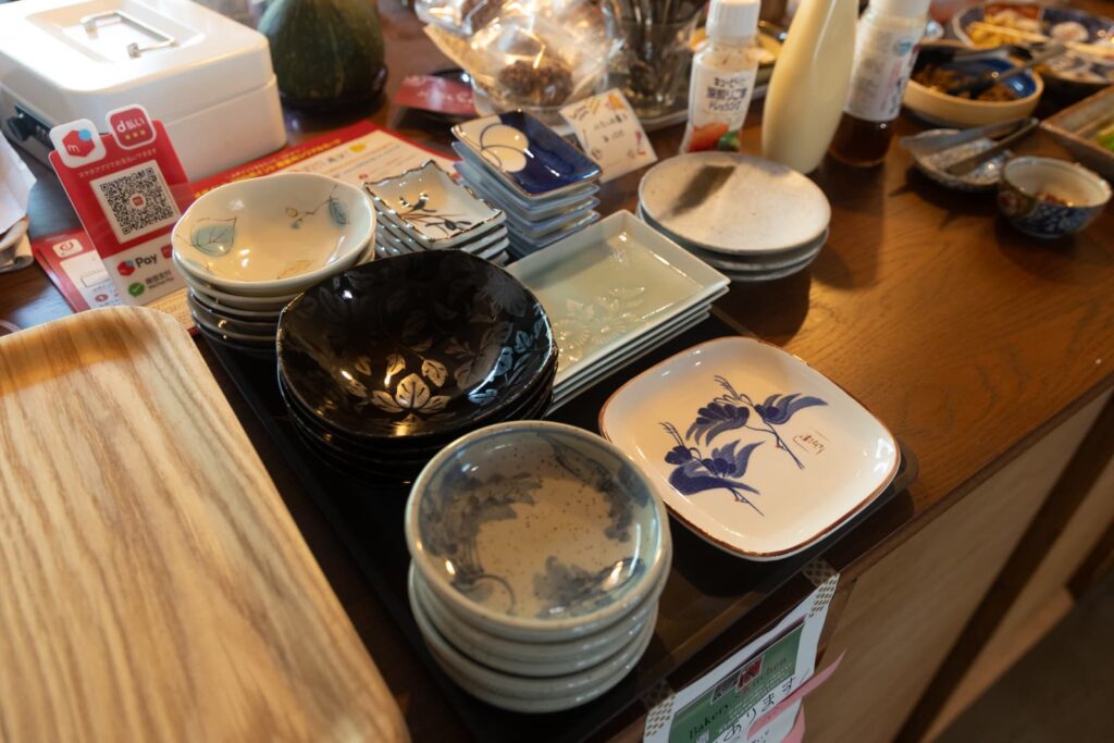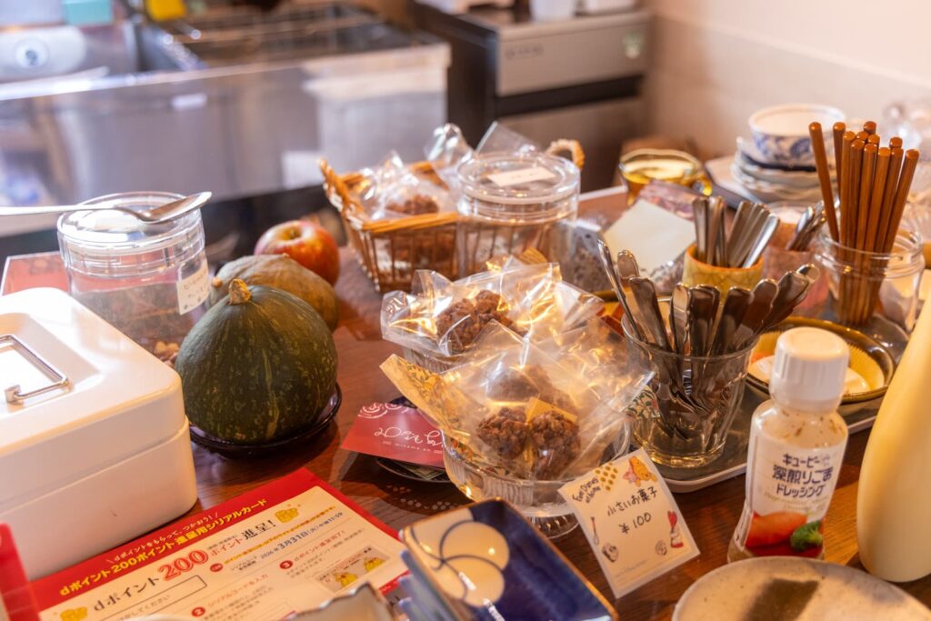 おかずは毎日日替わりで数品が用意されています。この日はきんぴらごぼうやカボチャサラダにオムレツ風の卵焼きなどがありました。