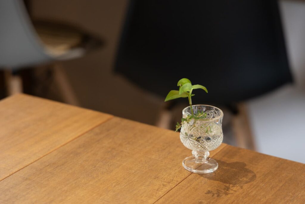 ちなみにテーブルはオーダーメイド。古木で作られたものだそうで、深い色合いが落ち着いた雰囲気を醸し出しています。
