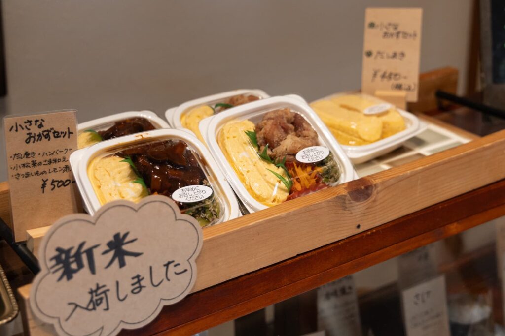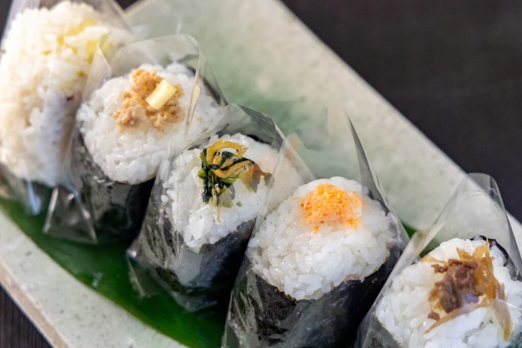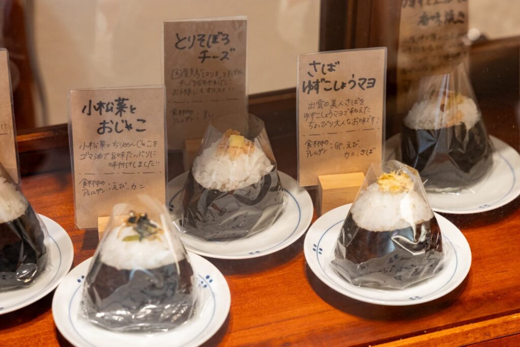 メニューは人気の「梅」、「さば柚子胡椒マヨ」、そして「小松菜とおじゃこ」、「さけ」、「牛肉とごぼうの甘辛」など、定番から季節限定まで常時10種類前後のおむすびが並びます。