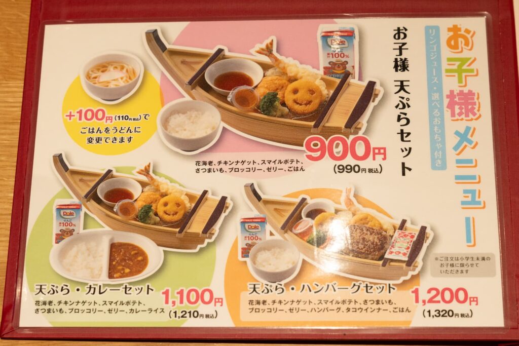 天ぷら御膳や天丼を中心に、子供から大人まで楽しめるメニューが用意され、枚方モール内で本格的な天ぷらを手軽に楽しめます。
