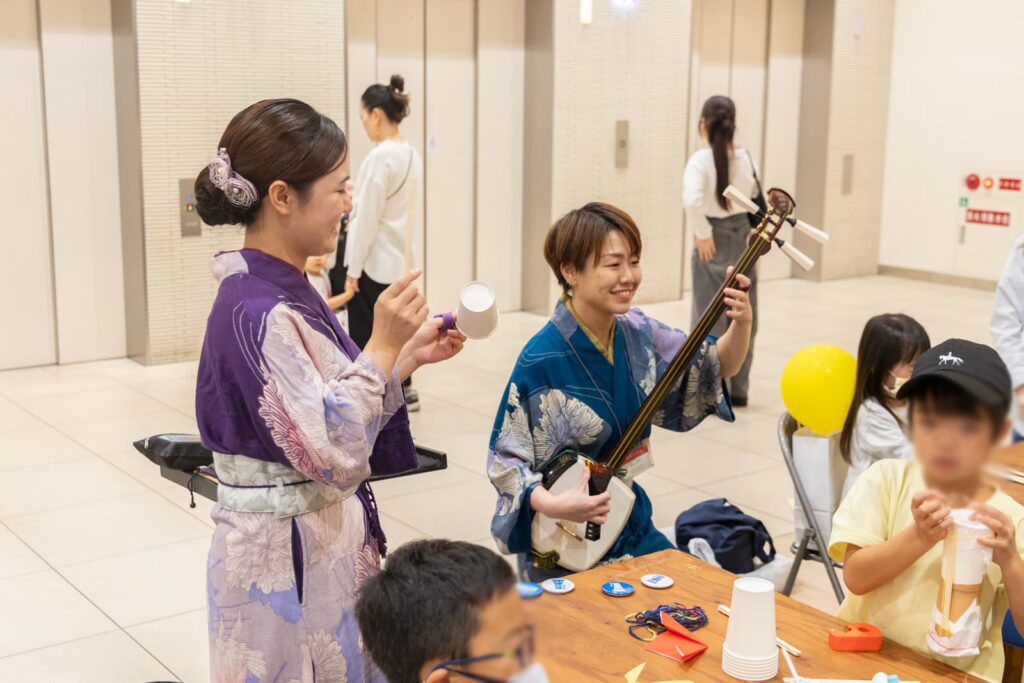 身近にある色々な廃材で楽器を作って、「ドンチリチッチ」の三味線や太鼓と一緒に楽しく演奏する企画も行われました。