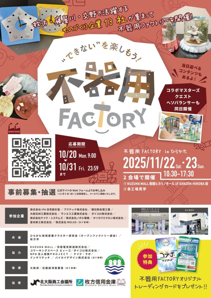 2025年11月22日(土)、23日(日)に、枚方を中心とするモノづくり企業が本気で考えた、子どもたちのワークショップ「不器用ファクトリー」が開催されます。
