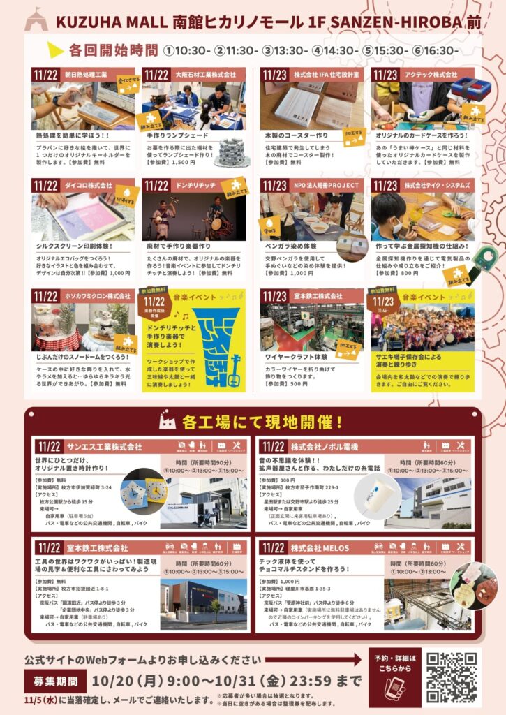 枚方周辺で活躍するものづくり企業が集まって、子どもたちにものづくりの楽しさを伝えるワークショップをイベント会場や各工場で開催。