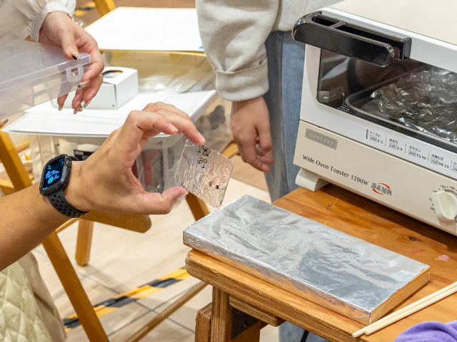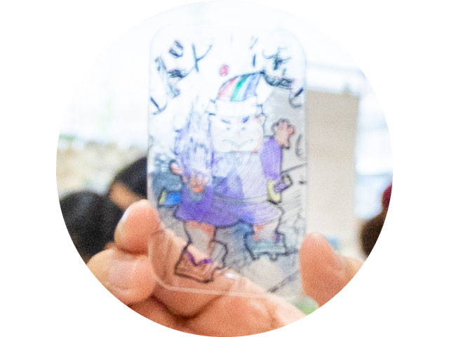 プラバンに好きな絵などを描いてから、トースターで熱処理することで、世界に1つだけのオリジナルキーホルダーを製作します。