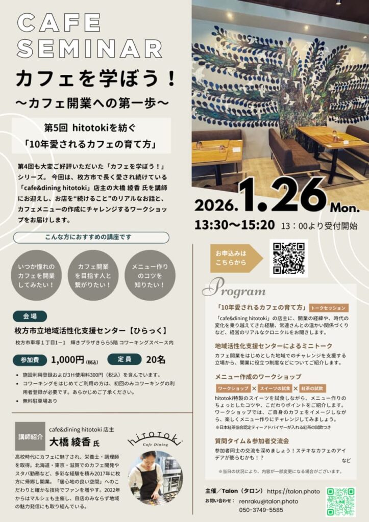 2026年1月26日(月)に、枚方市車塚にある枚方市立地域活性化支援センターひらっくにて、Talon主催カフェを学ぼう!~カフェ開業への第一歩~ 第五回 ヒトトキを紡ぐ『10年愛されるカフェの育て方』」が開催されます。