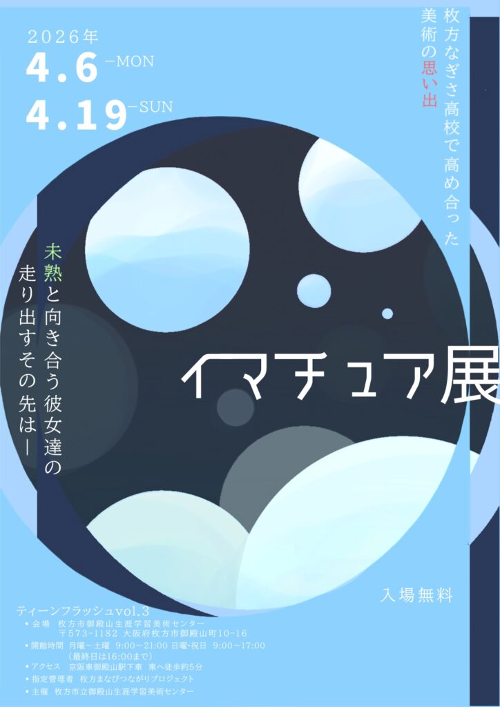 2026年4月6日(月)〜19日(日)の期間中、御殿山生涯学習美術センターにて、枚方なぎさ高校から京都芸術大学へ進学する5人の女性グループ展「イマチュア展」が開催されます。