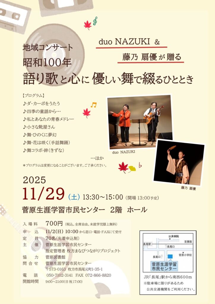 2025年11月29日(土)、枚方市立菅原生涯学習市民センターで「語り歌と心に優しい舞で綴るひととき」が開催されます。