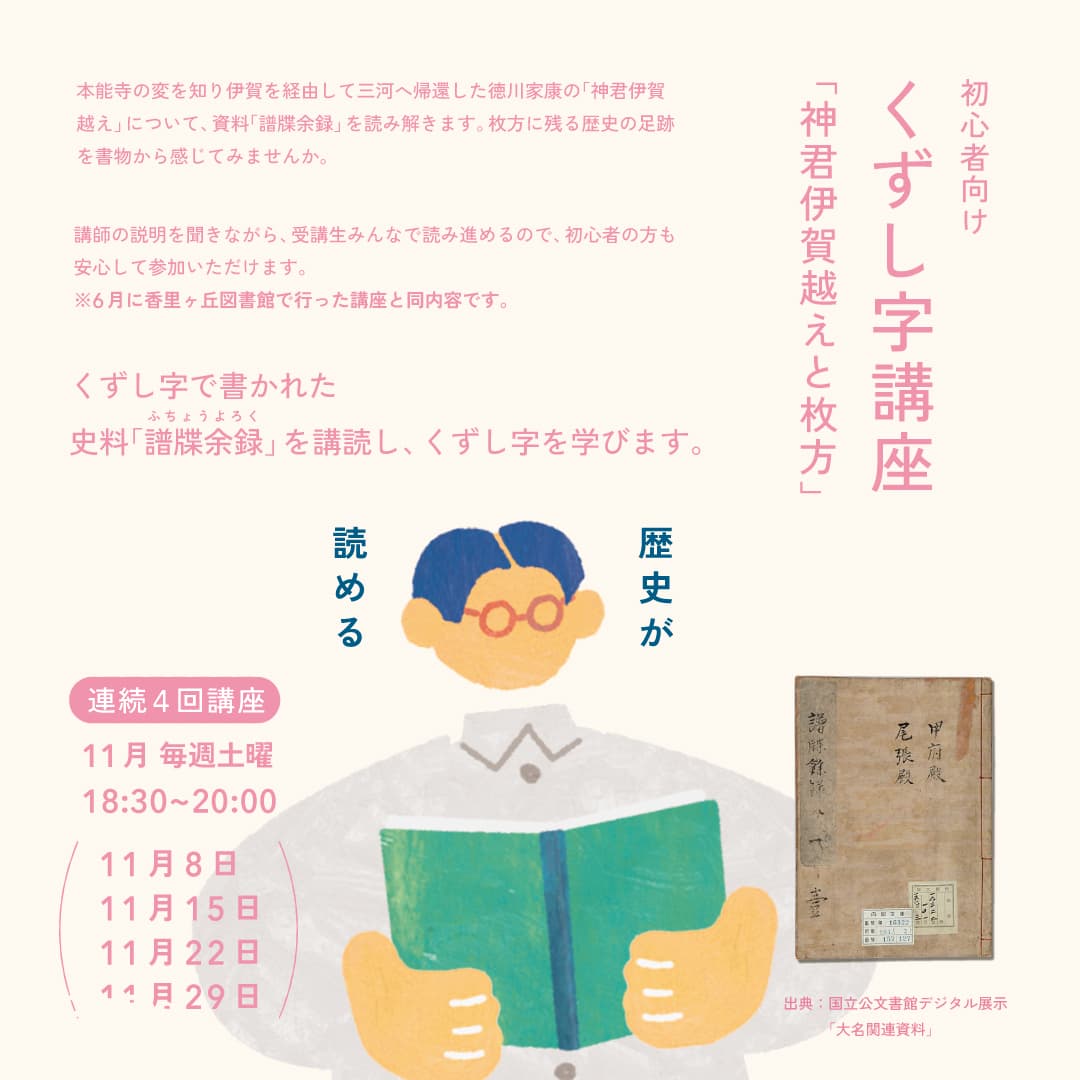 2025年11月の毎週土曜に、ステーションヒル枚方にある枚方市立生涯学習交流センターにて初心者向けのくずし字講座「神君伊賀越えと枚方」が開催されます。
