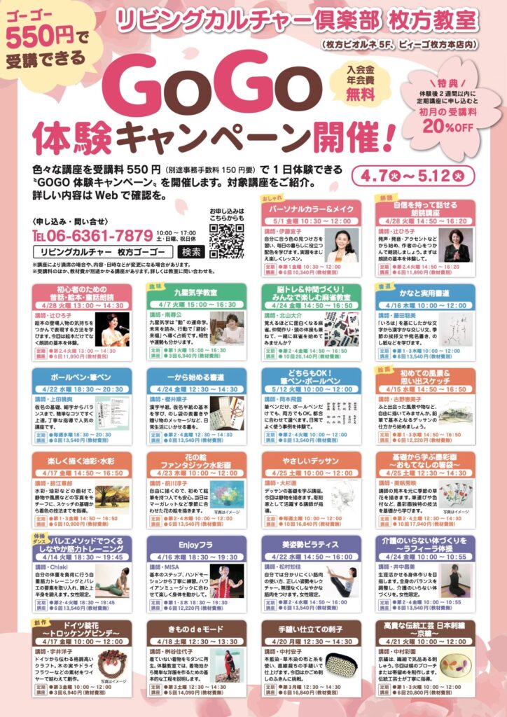 550円で体験できる!リビングカルチャー倶楽部「GoGo体験キャンペーン」開催〈4/7〜5/12 @枚方ビオルネ5F〉
