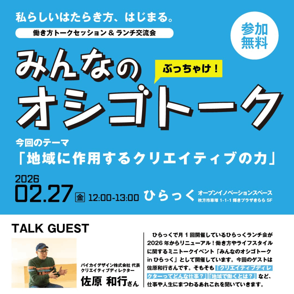 2026年2月27日(金)に、枚方市車塚にある枚方市立地域活性化支援センターひらっくにて、働き方やライフスタイルに関するミニトークイベント「みんなのオシゴトークinひらっく」が開催されます。