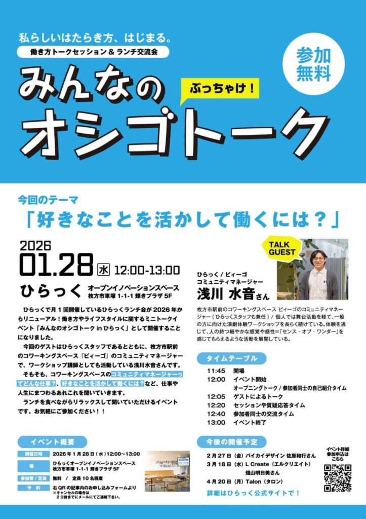 2026年1月28日(水)に、枚方市車塚にある枚方市立地域活性化支援センターひらっくにて、働き方トークセッション「みんなのオシゴトーク」が開催されます。